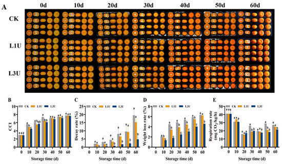 Four biological replicates of 100 fruits each were prepared to evaluate the decay rate. The decay rate was represented by the percentage of fruit that was diseased [10]. Thirty fruits were utilized to calculate the rate of weight loss. Weight loss was quantified as a percentage (%) of the initial weight and was calculated every 10 d [10].