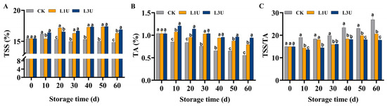 Effects of luteolin on: (A) total soluble solids (TSS), (B) titratable acid (TA), and (C) TSS/TA ratio of Nanfeng tangerines pulp during room temperature storage. Vertical bars represent the standard error of three replicates. Lowercase letters on a single day denoted a significant disparity (p < 0.05) between the control and luteolin treatment categories.