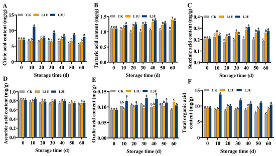 Effects of luteolin on: (A) citric acid, (B) tartaric acid, (C) succinic acid, (D) ascorbic acid, (E) oxalic acid, and (F) total organic acid contents in Nanfeng tangerines pulp during storage at room temperature. Vertical bars indicate standard error of three replicates. Lowercase letters on a single day denoted a significant disparity (p < 0.05) between the control and luteolin treatment categories.