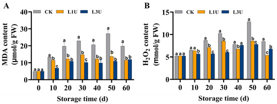 As depicted in Figure 4A, the MDA content in the peel of control fruit showed a fluctuating increase, succeeded by a rapid decrease on Day 60, whereas the MDA content in luteolin-treated fruit showed a mild increase throughout storage, significantly lower than in control fruit (p < 0.05) (Figure 5A). Similarly, a gradual increase in the H2O2 content was observed in the control group within 30 d of storage and fluctuated thereafter (Figure 5B). In the luteolin-treated groups, the H2O2 content showed a significant decrease in comparison to the control group (p < 0.05) (Figure 5B). In the three treatments, the MDA and H2O2 contents exhibited an increasing trend over time; however, the increasing intensity was significantly alleviated following L3U treatment (p < 0.05).