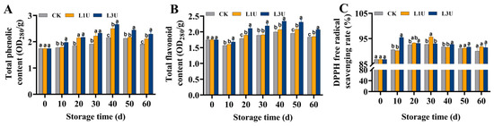 As shown in Figure 6A,B, both untreated and luteolin-treated fruits showed a gradual increase in total phenol and flavonoid contents, with peak levels observed at 40 days of storage; however, a slight decrease in total flavonoid content was observed on Day 10. Luteolin treatment resulted in the maintenance of elevated total phenol and flavonoid contents (p < 0.05) compared to the control group. The DPPH free radical scavenging rate, which was evaluated as the total antioxidant capacity, exhibited a gradual rise over the initial 20 days of storage and then decreased (Figure 6C). Luteolin treatment markedly elevated (p < 0.05) the free radical scavenging rate after 30 d and 10 d of storage under L1U and L3U, respectively. These findings demonstrate that luteolin treatment boosts antioxidant capacity through the increase in total phenol and flavonoid contents. The effect of L3U treatment on the antioxidant capacity was greater than that of L1U treatment.