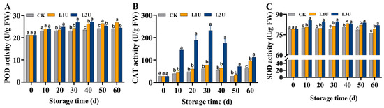 As shown in Figure 7A, throughout the storage period, there was a mild increase in POD activity in the peels of the control group. Conversely, the POD activity in the peels of the L1U treatment group exhibited a rapid initial increase over the first 10 days, then experienced a mild decline and an increasing trend thereafter; however, it exhibited a notable increase in comparison to the control group (p < 0.05). Similarly, the L3U treatment group showed dramatically higher levels compared to the control group during Days 0–50 of storage. The CAT activity in the peels of the control and L1U treatment groups showed identical trends, with a mild rise during the initial 30 days of storage, followed by a mild decrease on Day 50, whereas the CAT activity in the L3U treatment group exhibited a substantial enhancement in comparison to the other two groups (p < 0.05) (Figure 7B). The SOD activity in the control fruit exhibited a gradual decrease during the initial 40 days of storage, and then rapidly decreased thereafter; nevertheless, the luteolin treatment groups exhibited a significant enhancement in activity (p < 0.05) (Figure 7C). Moreover, the SOD activity in L3U-treated fruit showed a notable increase than that in untreated fruit across the entire storage duration (p < 0.05) (Figure 7C). These results indicate that luteolin treatment enhanced the activity of antioxidant enzymes of POD, CAT, and SOD in Nanfeng tangerines during storage.
