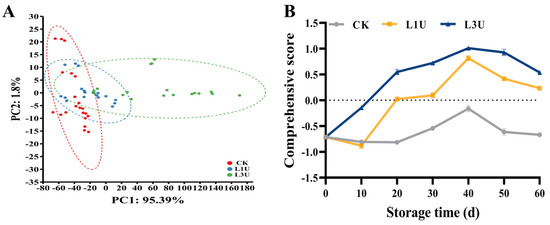 (A) Principal component analysis and (B) comprehensive score of Nanfeng tangerines treated with luteolin and stored at room temperatures.
