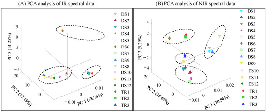Principal component analysis of infrared (A) and near-infrared (B) spectral data obtained from different dietary supplements, powdered turmeric, and ground turmeric rhizome. Commercial turmeric DS samples included eight capsules (DS-1-DS-7 and DS-9), one tablet (DS-8), three ground turmeric samples (DS-10-DS-12), and three ground turmeric rhizomes (TR-1, TR-2, and TR-3).
