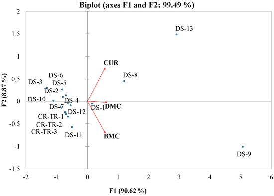 Principal component analysis of bisdemethoxycurcumin (BMC), demethoxycurcumin (DMC), and curcumin (CUR) obtained from different dietary supplements (eight capsules (DS-1-DS-7 and DS-9), one tablet (DS-8)), powdered turmeric (DS-10-DS-12), and ground turmeric rhizomes (TR-1, TR-2, and TR-3).