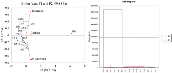 PCA and HCA (Hierarchical Cluster Analysis) were conducted to visualize the variations in the volatile compounds among the DS and dried rhizome samples (Figure 3). The results show that the DS and dried rhizome samples were easily differentiated from each other. It was also observed that DS-11 had a high level of volatile compounds compared to all other samples. The volatile compounds ar-tumerone, tumerone, and curlone were differentiated based on component F1 only. All dried rhizome samples (TR1-TR3) and DS samples DS-3, DS-4, DS-5, DS-6, DS-8, DS-9, DS-11, and DS-12 were differentiated by principal component F1, while DS samples DS-1, DS-2, DS-7, and DS-10 were differentiated by F2. Overall, the first and second components explained 99.9% of the total variances.