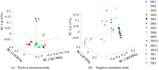 A PCA was conducted to amplify and detect the subtle differences between DS and rhizomes based on identified metabolites (Figure 4). A PCA of mass data obtained in positive ionization mode showed a distinct separation of DS-4 and DS-7 from the other analyzed samples. The first (PC1), second (PC2), and third (PC3) principal components explained 61.7%, 19.8%, and 8.3% of the variance in positive ionization mode, respectively. The loading plots show that PCA differentiates according to the curcuminoid keto and enol isomeric forms, alpha-curcumene, and caryophyllene oxide in both the first and second principal components, while piperine and curcuminoids isomers are differentiated in PC3. Similarly, the results obtained from the PCA of the mass data obtained in negative ionization mode display separation among the rhizome and DS samples. PC1, PC2, and PC3 explain 85.9%, 9.7%, and 2.5% of the total variance in negative ionization mode.
