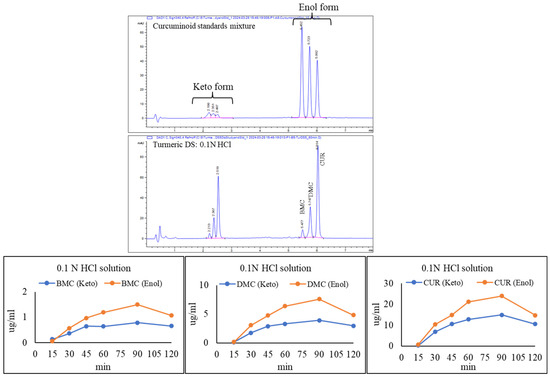 We also investigated the effect of acidic pH on curcuminoids from a single dietary supplement capsule in 0.1 N HCl solution. Chromatograms and data were collected at 340 nm to observe the changes in the keto-enol forms of curcuminoids (Figure 5). The results demonstrate that the release of curcuminoids (keto and enol forms of BMC, DMC, and CUR) from the capsule increased with time until 90 min. After that, both forms showed a decrease in their levels until 120 min.