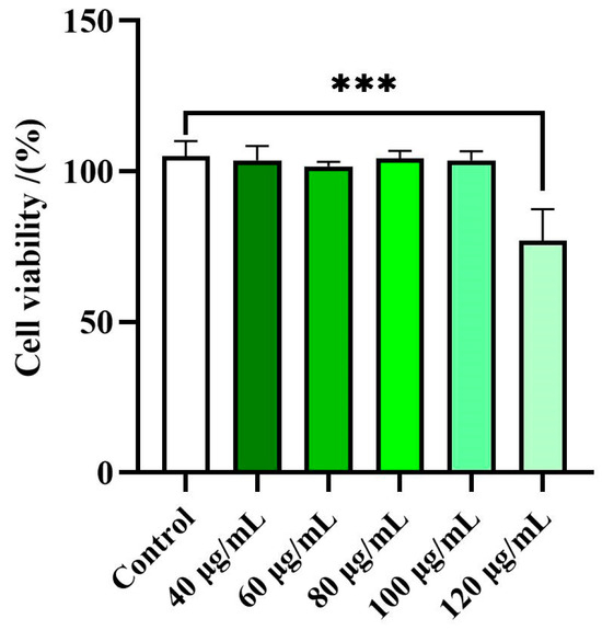 Preliminary experiments to evaluate the effects of the EE of Disporopsis aspersa on cell viability were carried out using a CCK-8 test. RAW 264.7 macrophage cells were treated with the EE at different concentrations (40–120 μg/mL) for 18 h. It is considered that a cell viability rate exceeding 80% indicates that the sample has no cytotoxic effect on the tested cells [66]. As illustrated in Figure 2, the 95% ethanol extracts (EE) exhibited no significant cytotoxicity towards RAW 264.7 cells at concentration below 120 μg/mL. Consequently, further studies on the EE were conducted, keeping the concentration below 120 µg/mL.