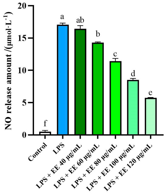 Cells (4 × 105 cells/well in 2000 μL of medium) were cultured overnight in a six-well plate. After cell adhesion, the varying concentration EEs were applied with or without 1 μg·mL−1 LPS to induce an inflammatory response. Blank controls were served as no LPS and no EE treatment. After 18 h incubation, the culture supernatant from each well was collected to measure the NO levels using an NO detection kit (Sigma-Aldrich, Saint Louis, MO, USA) to assess the level of inflammation in the culture medium.