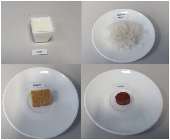 The research material comprised four products available on the Polish market that are characteristic of different world cuisines: ayran, rice noodles, chorizo, and tempeh. The selection of ayran, rice noodles, chorizo, and tempeh as the focus of this study was driven by their distinct cultural and culinary significance, as well as their growing presence in the Polish market. Ayran represents Middle Eastern cuisine, a category gaining popularity due to its refreshing qualities and health benefits as a fermented dairy product. Rice noodles were chosen as they exemplify Asian cuisine, which has become increasingly integrated into Polish dining habits due to its versatility and alignment with health-conscious dietary trends. Chorizo, a hallmark of Spanish cuisine, was included for its unique flavor profile and representation of European culinary traditions that resonate with Polish consumers. Finally, tempeh was selected as a representative of plant-based products and Indonesian cuisine, aligning with the rising interest in sustainable and vegetarian food options. These four products were deliberately chosen to reflect diverse culinary traditions and consumption trends, allowing for a comprehensive exploration of consumer preferences for distinct world cuisines in the Polish context.