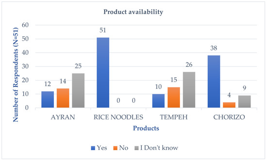When asked about the availability of the tested products in retail, respondents indicated that rice noodles are generally available in stores (51 respondents), chorizo is available according to 38 respondents, ayran according to 12 respondents, and tempeh according to 10 respondents (Figure 2).