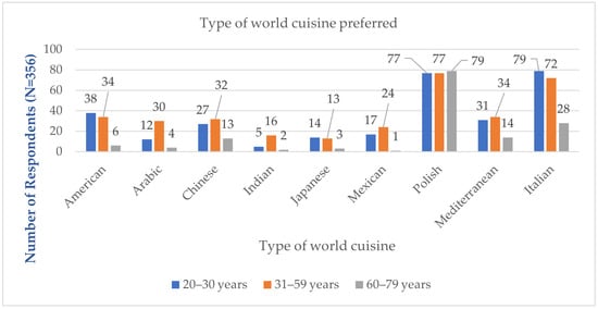 The most preferred world cuisine among respondents in the age group 23–30 is Italian cuisine (79 respondents) and Polish cuisine (77 respondents), while the least preferred is Indian cuisine (5 respondents). In the age groups 31–59 and 60–79, the most preferred world cuisines are Polish cuisine (77 and 79 respondents, respectively) and Italian cuisine (72 and 28 respondents, respectively). Figure 4 presents data on the type of preferred world cuisine.