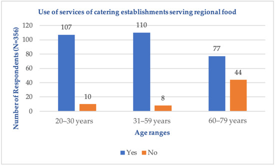 In response to the question “Do you use food establishments serving regional dishes during travel?”, most respondents in all age groups answered affirmatively. In the age group 60–79, 44 respondents answered negatively. These data are presented in Figure 5. These differences may stem from varying travel motivations and culinary preferences shaped by social, economic, and technological factors.