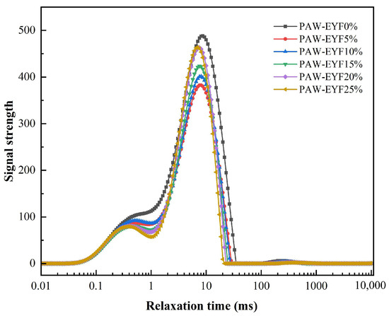 Moisture plays a crucial role in the production and processing of noodles. The degree of water binding with starch granules, gluten proteins, and the distribution of water within the noodles significantly affect their quality. Figure 1 shows the variation in the relaxation time of noodles with different additions of PAW-EYF. Each sample curve contained three peaks, representing the different states of water in the noodles: strongly bound water, weakly bound water, and free water, respectively. T21, T22, and T23 denoted the relaxation times of the strongly bound water, weakly bound water, and free water. Ti reflected the degree of interaction between water and other components in the noodles. A smaller relaxation time indicated a stronger binding of water, while a larger relaxation time suggested a greater proportion of free water [34]. As shown in Figure 1, compared to wheat noodles, the T21, T22, and T23 values of noodles with different PAW-EYF additions decreased, and the transverse relaxation time shifted to the left. This indicated that the content of bound water increased, the content of free water decreased, and the mobility of water in the noodles weakened.