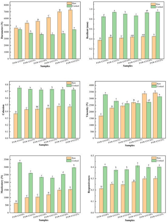 The effect of PAW-EYF addition on the texture properties of raw and cooked noodles. (In the figure, yellow represents the texture profile measurement results for raw noodles, while green represents the results for cooked noodles. Significant differences in the raw noodles are indicated by uppercase letters, whereas significant differences in the cooked noodles are indicated by lowercase letters).