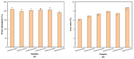 Dry matter absorbency is defined as the weight of cooked pasta expressed as a percentage of the weight of raw pasta. This measurement represents the ability of the pasta to absorb water during the cooking process [38]. The results of the effect of different PAW-EYF additions on the dry matter water absorption of noodles are shown in Figure 3a. As the PAW-EYF addition increased, the dry matter water absorption rate of yam noodles initially decreased, followed by a slight increase and then a subsequent decrease. This trend can be attributed to the disruption of the powder particle structure of yam flour during the modification process, which reduced water absorption and hindered its ability to closely interact with gluten proteins. Consequently, this led to a significant decrease in the dry matter water absorption of the produced yam noodles. In the noodles with added PAW-EYF, the highest water absorption was observed at a 20% addition, which may have been due to the modified yam flour enhancing the integrity of the gluten network in the dough and encapsulating the yam starch within that network, thus allowing for greater water absorption. Conversely, the lowest water absorption was observed at a 25% addition, which may have been related to the loss of excessive soluble matter during steaming.