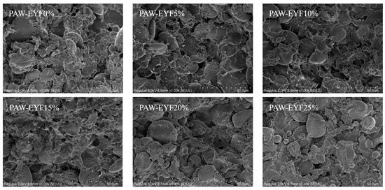 In noodles, gluten and starch not only play an important role in supporting the protein network but are also key to maintaining its stability [41]. The SEM microstructures of noodles with different PAW-EYF additions are shown in Figure 4. Compared with wheat noodles, the starch granules in yam noodles were more uniformly and tightly bound to gluten proteins, with aggregation phenomena visible in the cross-section. This phenomenon became increasingly pronounced with the increase in the PAW-EYF addition. This indicates that the addition of modified yam flour increased the binding capacity of starch granules to gluten proteins in the dough, making the starch granules more firmly integrated within the gluten network [38]. In addition, the starch granules on the surface of the noodles were severely deformed when the additive amounts were 5%, 10%, and 15%, and complete starch granules could hardly be seen to be exposed. At 20% and 25%, due to the high addition of PAW-EYF, the degree of starch pasting was reduced, causing changes in shape and preventing fusion between the granules, which allowed clear outlines of the starch granules to be observed.