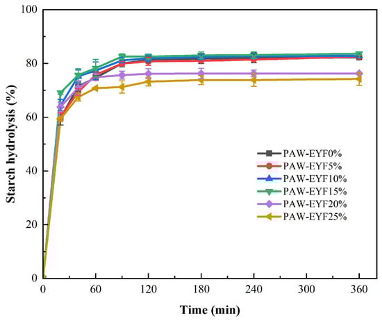 The enzyme hydrolysis curves of noodles with different PAW-EYF addition levels.