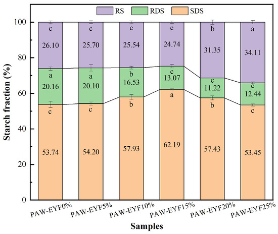 The SDS, RDS, and RS contents of noodles with different PAW-EYF addition levels. The lowercase letters in the figure indicate the significance of differences between groups. Identical letters indicate no significant difference, while different letters indicate a significant difference. It can be observed that the impact of different PAW-EYF addition gradients varies.