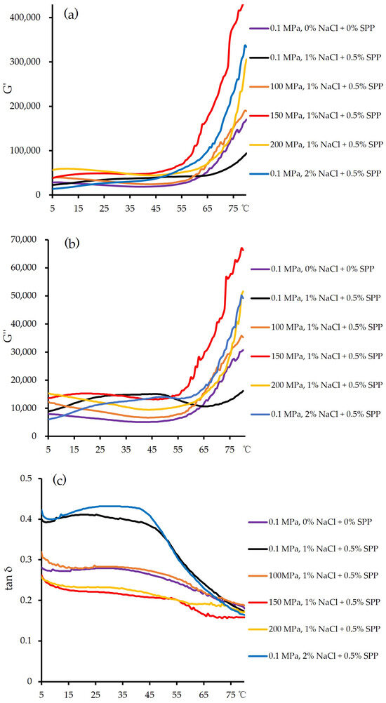 As the temperature increased to approximately 50–58 °C, the G′ and G″ values of the pork gel gradually rose, which suggested gel strengthening. At this stage, most of the proteins had unfolded, with increased cross-linking forming a network that strengthened the gel matrix, and this resulted in a robust and irreversible gel structure [34,35]. At 150 MPa, the G′ and G″ values of sodium-free and reduced-sodium pork gels exceeded those of untreated samples, which indicated that moderately high-pressure treatment promoted the formation of more elastic gels. This was likely because of the increased exposure of R-SH and hydrophobic groups in the high-pressure-treated myosin, which would enhance cross-linking during heating [36]. However, a further increase in the pressure to 200 MPa reduced both the G′ and G″ values and increased . This change indicated that excessive pressure adversely affected the gelling capacity of myosin. Similar trends were observed by Chen et al. [37] in myosin––carrageenan gels treated at high pressure (0–400 MPa), where moderate pressures (≤150 MPa) induced mild protein unfolding but most myosin molecules retained their native structure. Under such conditions, the protein unfolding rate exceeded aggregation as the temperature rose, which promoted a compact, uniform gel structure. Changes in G′ and G″ are closely tied to protein denaturation and aggregation levels [32].