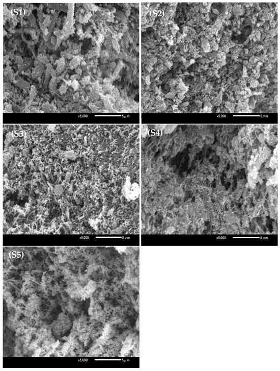 Figure 2 shows the microstructures of the thermal pork gels. In the untreated pork gels without sodium chloride and/or SPP addition (sample S1), many fragmented muscle fibers and coarse aggregates were evident. This suggests that myofibrillar proteins coagulated upon heating and formed large clumps. This result is consistent with the findings of Tintchev et al. [39], who observed a rougher matrix in reduced-NaCl frankfurter batters compared to conventional batters, indicating a less uniform structure. Typically, solubilized myofibrillar proteins, primarily myosin, form a three-dimensional network structure after heating [40]. Compared with S1, the microstructures of pork gels with added sodium chloride and SPP (samples S2–S5) exhibited higher homogeneity and fewer interstitial spaces, which resulted in a denser and more uniformly distributed three-dimensional mesh. Water and fat will be retained within this network, whereas a denser network holds a greater amount of water and fat and contributes to enhancing the water retention ability and structural integrity of the meat gels [41]. With high-pressure treatment within the range of 150–200 MPa (samples S2 and S3), the microstructure transitioned further and formed an improved dense and homogeneous network. In the samples with low sodium and treated at high pressure (samples S3 and S4), a distinct transformation from a fibrous structure to a three-dimensional lattice with larger pores was observed compared with the high-sodium S5 samples. The application of high pressure (150–200 MPa) appeared to influence protein unfolding, contributed to a reduction in myofibrillar protein particle size, and enabled a uniform alignment during subsequent heating. These changes promoted a compact and consistent gel network structure. Overall, the high-pressure treatment within the range of 150–200 MPa significantly improved the microstructural uniformity and density of the pork gels, especially in samples with reduced sodium.