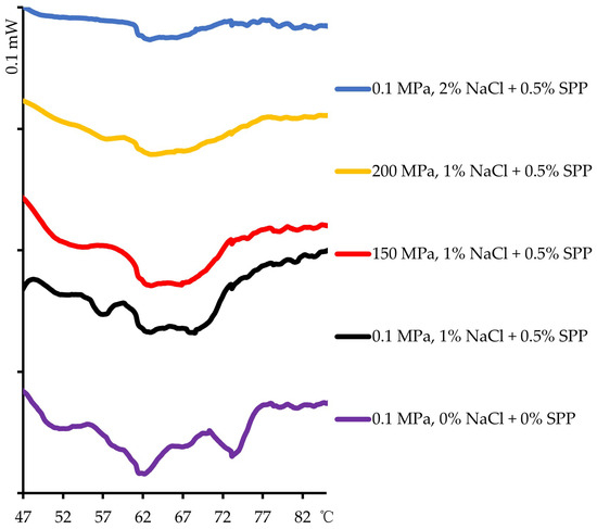 Differential scanning calorimetry thermograms of untreated pork gel, 1% NaCl pork gel treated at 0.1, 150, or 200 MPa, and 2% NaCl pork gel treated at 0.1 MPa. The y-axis scale divisions are equivalent to 0.1 mW.