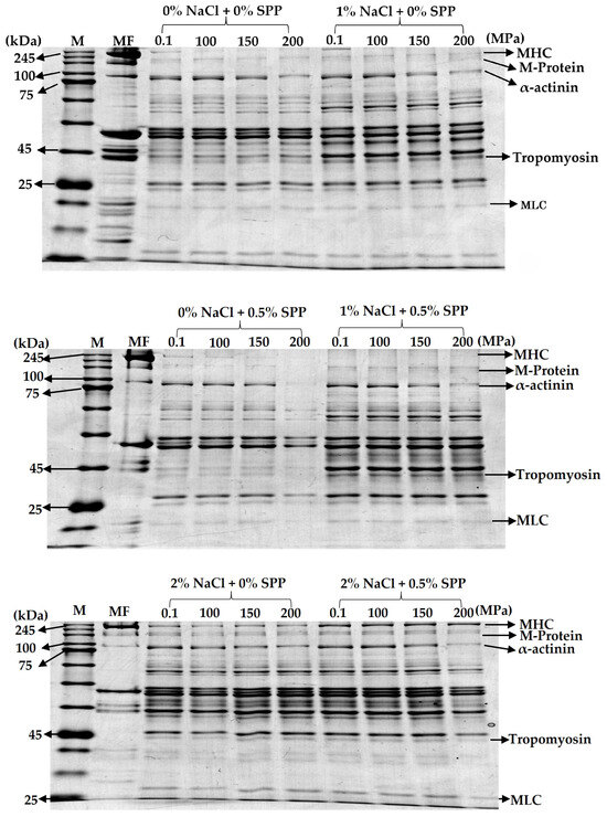 The protein solubilities in the pork gels increased with increases in the sodium concentration and pressure. High-pressure treatment led to the swelling of myofibrils, which ultimately resulted in them breaking into shorter filaments. This release of proteins, alongside pressure-induced unfolding of soluble proteins, may contribute to the enhanced gelation and binding effects observed with high-pressure processing [43]. The protein compositions of the supernatants of the unheated pork gels were analyzed using SDS-PAGE (Figure 4). With added sodium chloride and/or SPP, bands were observed at approximately 160 kDa, which indicated increased solubilization of myofibrillar proteins and a higher soluble protein content. The 160 kDa M-protein, located in the M-line, disappears upon sodium chloride addition, which is closely linked to the breakdown of myofibrillar structure [19,29].