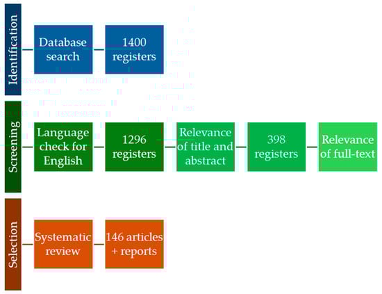 The search terms were adapted for each database to optimize the retrieval of relevant studies. Regarding study classification, articles were initially screened based on the relevance of their titles and abstracts. Those passing this preliminary screening underwent a full-text review. The classification of studies was based on their alignment with the review’s objectives, focusing on the relevance and depth of information they provided. The selection criteria were that the (i) full text was available, and (ii) full text was published in English. Theses, letters to editors, and papers presented at conferences were excluded. The flowchart in Figure 1 summarizes the review methodology.