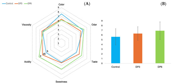 Sensory evaluation (A) and overall acceptance (B) of fortified kefir. Control: kefir without date paste added; DP3: kefir with 3% date paste added; DP6: kefir with 6% date paste added. Data are presented as mean ± SD. Different letters indicate statistically significant differences as determined by Tukey’s HSD post hoc test (p < 0.05).