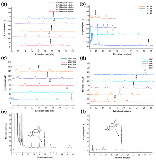 The effect of different chromatographic conditions on the peak time and separation of OA in BRE, as well as the optimized chromatograms of the sample and standard. (a) The influence of different phosphate buffer solutions; (b) the impact of different flow matching ratios; (c) the impact of different flow velocities; (d) the influence of different column temperatures; (e) chromatogram of Boschnikia rossica sample; and (f) chromatogram of oleanolic acid (OA) standard solution.