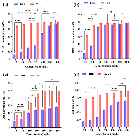 In vitro antioxidant activity of different concentrations of BRE. (a) ABTS radical scavenging ability; (b) DPPH radical scavenging ability; (c) •OH radical scavenging ability; and (d) β-carotene bleaching inhibition ability. ****, ***, **, *, and ns, respectively, represent p < 0.0001, p < 0.001, p < 0.01, p < 0.05, and p > 0.05.