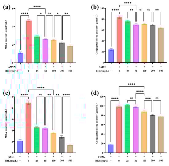 The effect of BRE on FeSO4- and AMVN-induced LA peroxidation, (a) BRE-induced changes in MDA content by AMVN; (b) BRE induces changes in conjugated diene content in AMVN; (c) BRE induces changes in MDA content in FeSO4; and (d) BRE induces changes in conjugated diene content induced by FeSO4. ****, ***, **, *, and ns, respectively, represent p < 0.0001, p < 0.001, p < 0.01, p < 0.05, and p > 0.05.