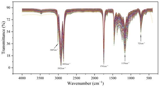 The FTIR spectra of all spiked samples were systematically recorded as shown in Figure 1, with consistent absorption features observed across all oil samples [36]. Different colors lines were utilized to denote distinct sample spectral curves. The characteristic peak at 1159 cm−1 was attributed to C-O ester bond stretching vibrations. Similarly, the absorption band at 1743 cm−1 was assigned to C=O double bond stretching vibrations. The spectral signatures at 2852 cm−1 and 2922 cm−1 were identified as stretching vibrations of methylene (-CH2-) and methyl (-CH3) groups, respectively. Furthermore, prominent C-H bond stretching vibrations were detected within the 2800–3000 cm−1 [37] region. Notably, a distinct absorption band corresponding to C-Cl bond stretching vibrations was observed in the 700–800 cm−1 range. This region was recognized as one of the characteristic fingerprints of 3-MCPD, and could serve as a supplementary indicator for quantification [25].