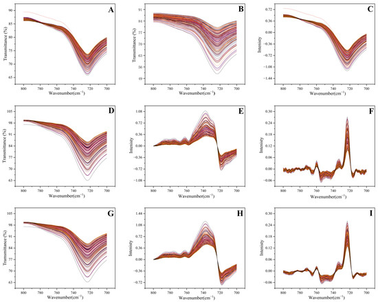 FTIR spectra of 3-MCPD exhibiting characteristic absorption bands (700–800 cm−1) across different preprocessing methods. (A) MSC, (B) SGS, (C) SNV, (D) NL, (E) D1, (F) D2, (G) NL-SGS, (H) NL-SGS-D1, (I) NL-SGS-D2.