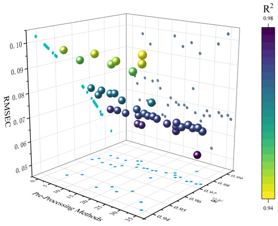 Three-dimensional representation of model performance across hybrid preprocessing method. The X-axis denotes method number, the Y-axis represents the values of R2c, and the Z-axis corresponds to the values of RMSEC.