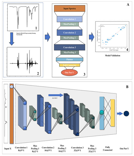 Schematic representation of CNN for quantitation of 3-MCPD in edible oil samples. (A) Schematic diagram of the NL-SGS-D2-CNN; (B) detailed illustration of the CNN architecture.