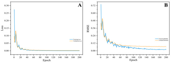 The training dynamics during the CNN constructed were shown in Figure 5, including the progressive changes in Loss (Figure 5A) and RMSE (Figure 5B). It could be seen that as the model iterated, the RMSE value and the model’s Loss value were gradually decreased, and eventually returned to convergence, with the performance of model being gradually improved. The largest change in model performance was observed within the first 40 epochs during the model training process. This improvement was attributed to the Adam algorithm’s adaptive learning rate adjustment, which facilitated substantial gradient updates during the early training phase [40]. The negligible divergence between the two curves demonstrates the model’s generalization capability, reflecting the efficacy of the CNN training protocol. These mechanisms collectively enhanced model convergence efficiency and robustness. Overall, the model exhibited strong training performance and stability.