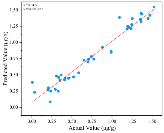 To rigorously evaluate the detection efficacy of the optimized CNN model in 3-MCPD quantitation, a dedicated prediction cohort was subjected to comprehensive validation. The detection performance of the hyperparameter-optimized CNN model for 3-MCPD concentration was presented in Figure 6. The R2 value for the prediction of 3-MCPD in actual fried samples was 0.9479, while the RMSE was 0.1027. The LOD and LOQ for 3-MCPD in this method were determined to be 0.3637 µg g−1 and 1.1021 µg g−1, respectively. The LOD was within the acceptable limit in the EU regulatory standard (1.25 μg g−1 for 3-MCPD in edible oils and fats) [41]. However, the LOQ of the NL-SGS-D2-CNN method was significantly higher than that of the AOCS method (0.002 μg g−1), but still complied with the detection criteria. Meanwhile, high model complexity was caused by the 3600-dimensional input. Therefore, further research was required in the future to improve the sensitivity of the method.