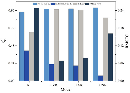 The modeling efficacy of different stepwise hybrid preprocessing methods including R2C and RMSEC in PLSR are detailed in Figure 3, and performance specifics are provided in Table S1. The model without preprocessing achieved an R2C of 0.9656 and an RMSEC of 0.0771. All the preprocessing methods, except SGS-SNV, NL-MSC, MSC, NL-SGS-MSC, SGS-MSC, and NL-SGS-SNV, were found to increase model performance. Specifically, the model after MSC processing exhibited R2C and RMSEC values of 0.9456 and 0.0970. This was attributed to the fact that although the MSC method enhanced spectral quality, the shape trends of the processed spectra were altered. Consequently, additional noise was learned by the model, which negatively impacted its performance. As for D1 preprocessing, the model’s R2C was increased to 0.9685, and the RMSEC was reduced to 0.0738. D2 preprocessing further improved the model performance, with R2C and RMSEC values of 0.9746 and 0.0663. These results demonstrated that critical spectral information was moderately enhanced through derivative preprocessing.