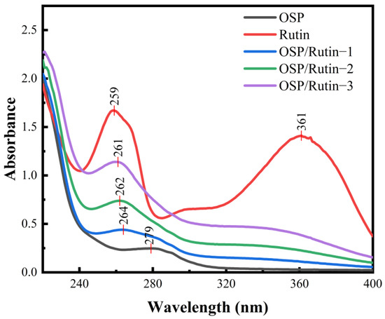 OSP, OSP/Rutin-1, OSP/Rutin-2, and OSP/Rutin-3 aqueous solutions at 0.2 mg/mL and rutin aqueous solution at 0.04 mg/mL were prepared. Distilled water was used as a blank control. Their UV spectra (220–400 nm) were measured using a spectrophotometer with a scanning interval of 1.0 nm.