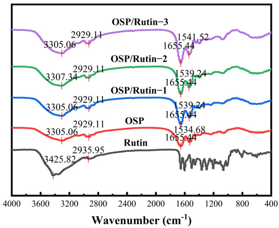FT-IR spectra of OSP, rutin, and the OSP/rutin covalent complexes.