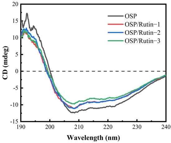 CD is frequently employed to characterize changes in the secondary structure of proteins upon interaction with ligands. The far-UV region (190–240 nm) can reflect the conformational change of the protein skeleton. As shown in Figure 3, OSP exhibited negative peaks at 208 nm and 222 nm, characteristic of an α-helix structure, and concurrently displayed a peak characteristic of a β-sheet structure at 218 nm [32], indicating that the secondary structure of OSP comprised relatively high proportions of both α-helices and β-sheets. However, after covalent conjugation of OSP with rutin, the peak intensities at 208 nm and 222 nm were attenuated, and shifts of varying degrees occurred. This is because upon the formation of covalent complexes between OSP and rutin, rutin induced conformational changes in OSP (Table 1). The addition of rutin caused the unwinding of the α-helix structure of OSP, leading to a transition towards other structural conformations. Usually, the content of α-helices correlates with the rigidity of the protein. Such transformations led to a decrease in the proportion of ordered structures within OSP, while the proportion of disordered structures ascended. Consequently, the overall structure became more loosely organized and had enhanced flexibility, thereby facilitating interactions with small molecules [33]. Liu et al. [34] reported that covalent binding of caffeic acid and ovalbumin also resulted in a decline in α-helices and an increase in random coils.