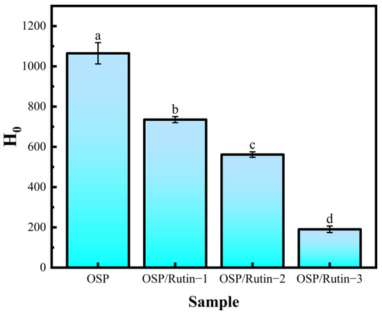 For the surface hydrophobicity assay, H0 reflects the quantity of hydrophobic groups in contact with the environment, and alterations in H0 can further influence the functional properties of proteins, such as emulsifying capacity and solubility [38]. Wang et al. reported that the emulsifying properties of soy protein varied with changes in surface hydrophobicity [39]. In Figure 5, compared to OSP, the H0 value of the OSP/rutin covalent complex was significantly reduced. Notably, the H0 value for OSP/Rutin-3 reached the lowest level at 190.43 ± 16.32. This indicated that covalent bonding with the hydrophilic groups of rutin (such as phenolic hydroxyl groups) led to the disruption of hydrophobic amino acids within the OSP molecule, thereby increasing its hydrophilicity. This conclusion was also validated in the fluorescence spectra of both OSP and the OSP/rutin covalent complex. Sun et al. found that the stability of the emulsion could be enhanced by adjusting the interfacial properties (surface hydrophobicity, etc.) of the complex particles [40].