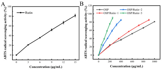 ABTS radical scavenging ability of rutin (A), OSP, and the OSP/Rutin covalent complexes (B).