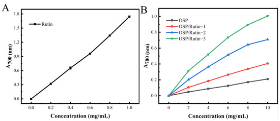According to the method of Zhou et al. [25], the sample solutions of different concentrations (0–1.0 μg/mL for rutin; 0–10 μg/mL for OSP and OSP/rutin complexes), potassium ferricyanide solution (1%, w/v), trichloroacetic acid solution (10%, w/v), and FeCl3 solution (0.1%, w/v) were prepared with PBS buffer (0.2 mol/L, pH 6.6). Then, 0.5 mL of sample solution, 2.5 mL of PBS, and 2.5 mL of potassium ferricyanide solution were mixed in a 10 mL centrifuge tube and incubated in water at 50 °C for 20 min. After the reaction, they were cooled rapidly. Subsequently, 2.5 mL of trichloroacetic acid was added and centrifuged at 3000× g for 10 min. Finally, 2.5 mL of the supernatant, 2.5 mL of distilled water, and 0.5 mL of FeCl3 solution were mixed and allowed to react for 10 min. The absorbance of the mixture was then measured at 700 nm, which reflected the reducing power of the sample.