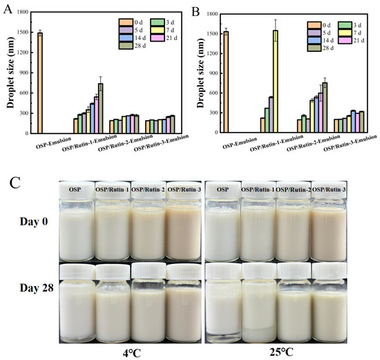 The physical stability of emulsions during manufacturing, transportation, storage, and usage is a critical aspect of their practical application. External affecting factors include mechanical shear forces and temperature during manufacturing, vibrations/temperature fluctuations during transportation, light exposure/microbial contamination/oxygen exposure during storage, and environmental pH variations/mechanical disturbances/temperature changes during usage. Temperature variations can influence the stability of emulsions through multiple mechanisms. The droplet size reflects the degree of aggregation of emulsion droplets, which significantly influences various aspects of the emulsion, including its properties, appearance, and application performance. The smaller the droplet size, the higher the stability of the emulsion, and prolonged storage is less likely to result in sedimentation and phase separation [45]. Polyphenols can significantly alter the secondary structure of proteins through covalent binding, leading to a decrease in sulfhydryl groups and tyrosine residues, promoting the exposure of molecular hydrophobic regions, and enhancing surface activity. This structural modification renders the composite more prone to adsorb at the oil–water interface, thereby reducing interfacial tension. Furthermore, the incorporation of polyphenols increases the hydroxyl group density on molecular surfaces, forming a denser interfacial film through hydrogen bonding and electrostatic repulsion, which effectively inhibits droplet coalescence. This study systematically investigated the changes in droplet size and appearance of four emulsions stored at 4 °C and 25 °C over a period of 28 days (Figure 8). The droplet size of the freshly prepared OSP-Emulsion was approximately 1500 nm, whereas the emulsions prepared from the OSP/rutin covalent complex exhibited droplet sizes below 220 nm, characteristic of typical nanoemulsions [46]. This result suggested that the increased hydrophilicity of the OSP/rutin covalent complex could effectively reduce the interfacial tension between the two phases at the oil–water interface of the emulsion, promoting the formation of smaller and more uniform droplets to form a stable nanoemulsion. With the extension of storage time, the droplet sizes of the emulsions all increased to varying degrees. Among them, the OSP-Emulsion was the most unstable, with the largest change in droplet size. After being stored for three days at 4 °C and 25 °C, a phenomenon of oil–water separation was observed in both conditions. At the same time, nanoemulsions formed by covalent complexes had smaller particle sizes and a more stable emulsion appearance. After 28 days of storage, the droplet sizes of OSP/Rutin-3-Emulsion were 263 nm (4 °C) and 318 nm (25 °C) respectively, both remaining below 320 nm. Compared to 25 °C, the variation in the droplet size of the emulsion at 4 °C was relatively mild. This was attributed to the fact that higher temperatures accelerated molecular motion, thereby increasing the collision frequency among droplets within the emulsion. If the repulsive forces between droplets were insufficient to overcome the attractive forces during collisions, it could facilitate droplet coalescence, leading to an increase in the droplet size [47].