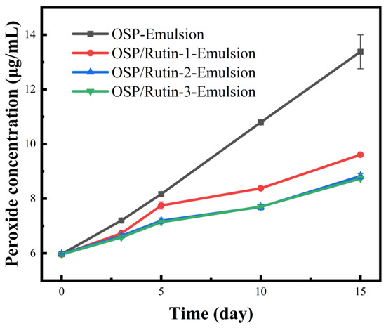 Nanoemulsions possess a large specific surface area, allowing for extensive contact between the lipids in the oil droplets and oxidants at the oil–water interface, thereby facilitating oxidation [48]. Furthermore, sunflower seed oil contains high levels of oleic and linoleic acids, which render the nanoemulsions more susceptible to oxidation. To evaluate their anti-lipid oxidation capability, the emulsions were prepared using sunflower oil, and the changes in peroxide content of each emulsion were examined over a 15-day storage period at 50 °C. As illustrated in Figure 9, the peroxide content ascended over time with extended storage. The most rapid increase in peroxide content was observed in OSP-Emulsion, followed by OSP/Rutin-1-Emulsion. The increases in OSP/Rutin-2-Emulsion and OSP/Rutin-3-Emulsion were relatively similar, which may be attributed to the strong antioxidant properties of rutin. When its concentration exceeds a certain threshold, the antioxidant effect remains stable over a specific period. Geng et al. [49] also reported similar findings in the construction of Pickering nanoemulsions, noting that when dihydromyricetin exceeds a certain concentration, there is no significant difference in the antioxidant effects among the emulsions. It could be inferred that the nanoemulsion constructed from the covalent complex of OSP/rutin effectively inhibited the formation of peroxides, thereby maintaining the quality of the emulsion and extending its shelf life. This is because the strong antioxidant activity of rutin could directly inhibit lipid oxidation, while the OSP/rutin covalent complexes also enhanced the interfacial physical barrier to block the diffusion of oxidizing agents.