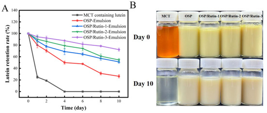 Lutein is a naturally occurring fat-soluble bioactive ingredient with strong antioxidant activity and can effectively resist ultraviolet radiation and prevent diseases such as senile macula and cataracts [50]. However, lutein is characterized by instability, exhibiting sensitivity to changes in external environmental factors such as the pH, ionic strength, temperature, light, and oxygen. This instability limits its application in foods. Frede et al. found that the construction of lutein-loaded emulsions can effectively prevent the oxidation of lutein and improve the stability of lutein. Therefore, this study investigated the capability of the emulsions developed by the OSP/rutin covalent complexes to protect lutein from UV irradiation [51]. In Figure 10A, all emulsions exhibited superior lutein protective capacity compared to the control group MCT. On the fourth day of UV irradiation at 30 °C, the lutein in MCT decreased to 0. At this point, the lutein retention rates of OSP-Emulsion, OSP/Rutin-1-Emulsion, OSP/Rutin-2-Emulsion, and OSP/Rutin-3-Emulsion, were 49.89%, 68.94%, 78.94%, and 87.67%, respectively. It was obvious that the lutein protection effect of nanoemulsions constructed covalent complexes was significantly superior to that of OSP-Emulsion, which was attributed to the antioxidant capacity and UV absorption of rutin. In particular, after 10 days of UV irradiation, the retention rate of lutein in the nanoemulsion constructed the covalent complex remained above 50%. The protective effect of the nanoemulsion prepared with the OSP/rutin covalent complex on lutein was better than that prepared using a dihydromyricetin/α-lactalbumin covalent complex [43]. Based on the appearance of the emulsions (Figure 10B), after 10 days of UV irradiation at 30 °C, the lutein in the MCTs had completely disappeared, and all the emulsions had undergone discoloration, with OSP-Emulsion exhibiting the most pronounced fading.