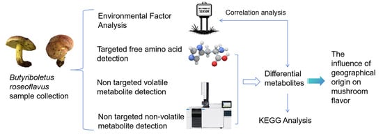 In summary, there is currently a lack of systematic identification of flavor compounds in B. roseoflavis, and no comprehensive studies have yet examined whether its flavor profile is significantly influenced by geographic origin and associated environmental factors. Therefore, this study employed integrated UPLC-MS/MS and HS-SPME-GC-MS analyses to characterize the volatile and non-volatile metabolite profiles of B. roseoflavus collected from different regions. Key flavor compounds were identified, and their potential associations with geographical and environmental variables were further explored (Figure 1). These findings provide a scientific foundation for the future development and utilization of B. roseoflavus as a high-value mushroom resource.